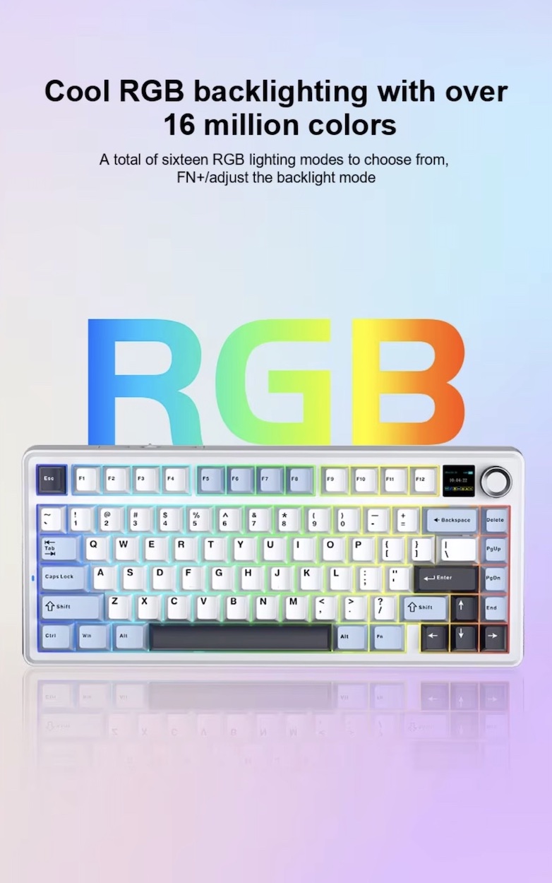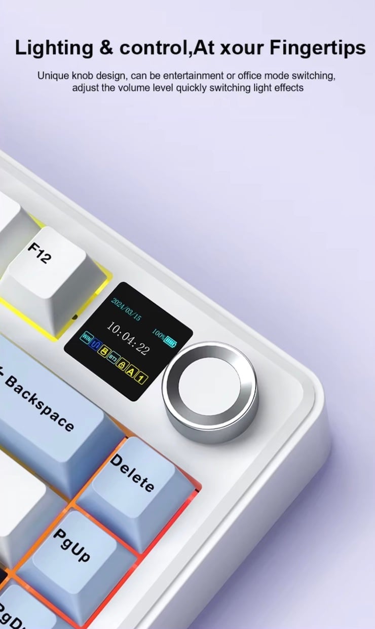 الذي يجمع بين التصميم العصري والتقنيات المتطورة. يأتي بشاشة TFT ذكية لعرض المعلومات والأنماط المخصصة، ومقبض تحكم مريح لتغيير الصوت أو الإضاءة بسهولة. يمنحك هذا الكيبورد تجربة كتابة ناعمة وصوتًا سلسًا بفضل تصميم gasket mount والمفاتيح الكريمية المشحمة مسبقًا، ليكون الخيار المثالي للألعاب أو العمل المكتبي.